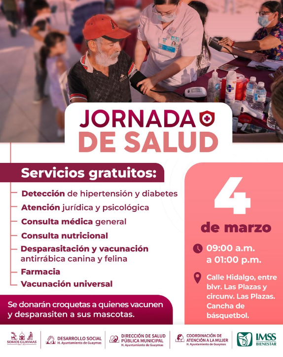 Con servicios gratuitos encaminados al cuidado de las familias, siendo esto un compromiso de la doctora Karla Córdova González, este miércoles 4 habrá Jornada de salud en la colonia Las Plazas, esto organizado por el Ayuntamiento de Guaymas a través de Desarrollo Social, dirección de Salud, C...