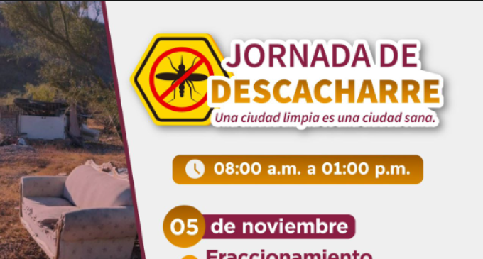 En prevención de enfermedades como dengue, zika y chikungunya, y mantener espacios más limpios, el Ayuntamiento de Guaymas en coordinación con las direcciones de Desarrollo Social, Servicios Públicos y Salud Pública Municipal, llevará a cabo una Jornada de Descacharre en el Fraccionamiento Villa Zarina, Fátima y Yucatán.